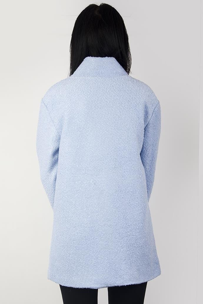 Jasnoniebieski płaszcz zapinany na guziki. Posiada kieszenie.