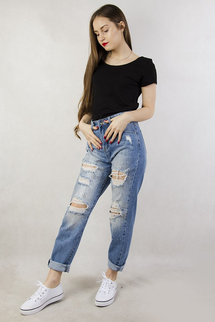 Spodnie jeansowe typu boyfriend z cyrkoniami i dziurami. Posiadają wysoki stan.