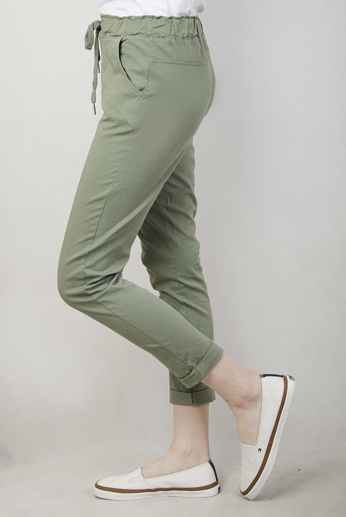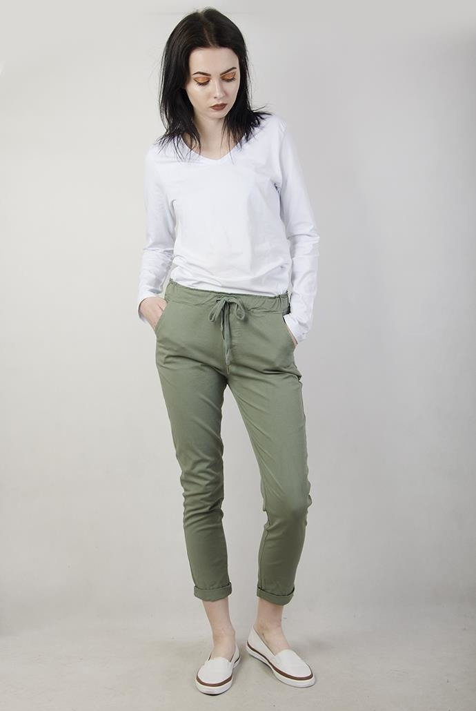 Zielone spodnie z wiązaniem i gumą w pasie.