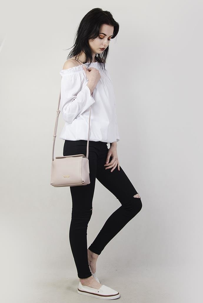 Biała bluzka z szerokim dekoltem i gumką na górze i dole.