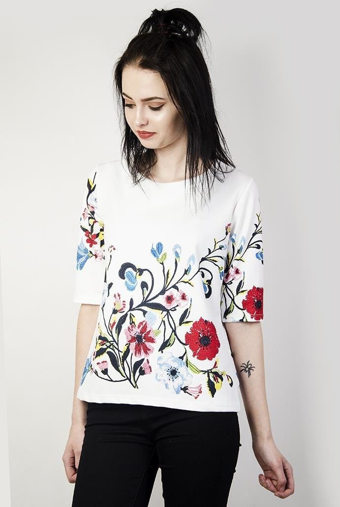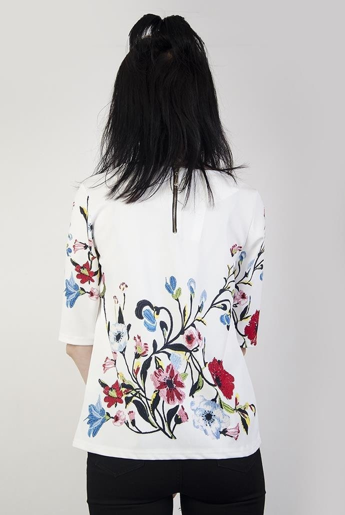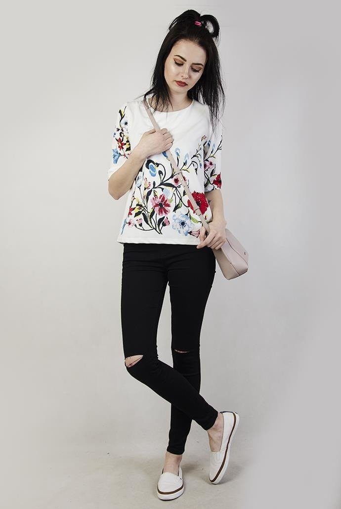 Biała bluzka w kwiatowe wzory, z zamkiem z tyłu.