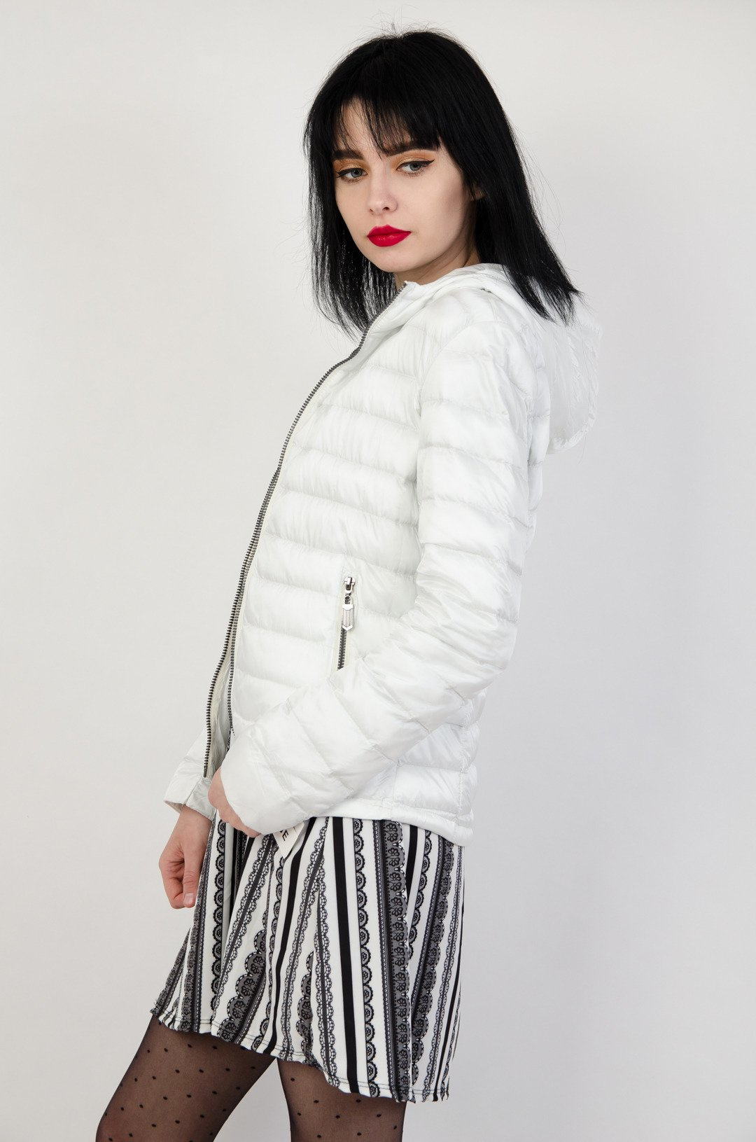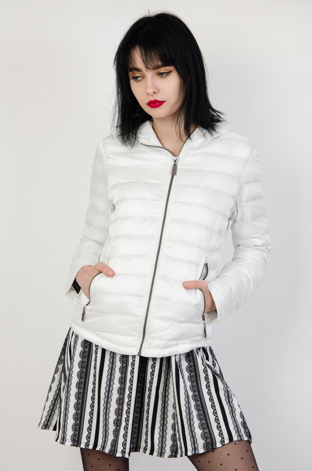 Biała kurtka pikowana, ze srebrnymi zamkami.