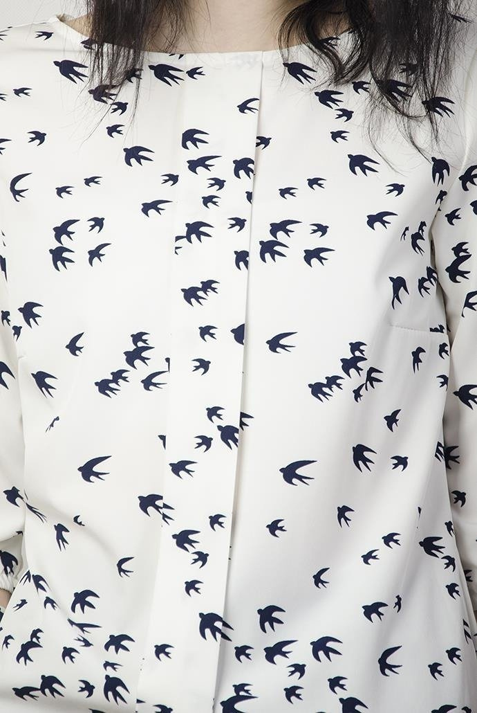 Biała bluzka w czarne jaskółki. Posiada gumkę na dole oraz przy rękawie.