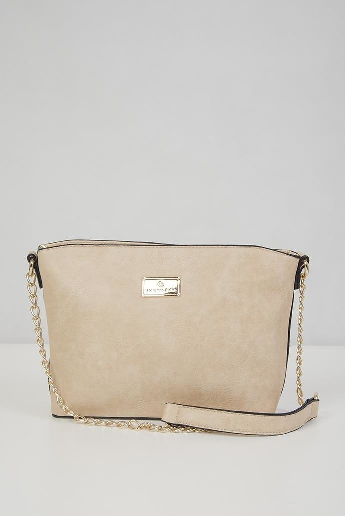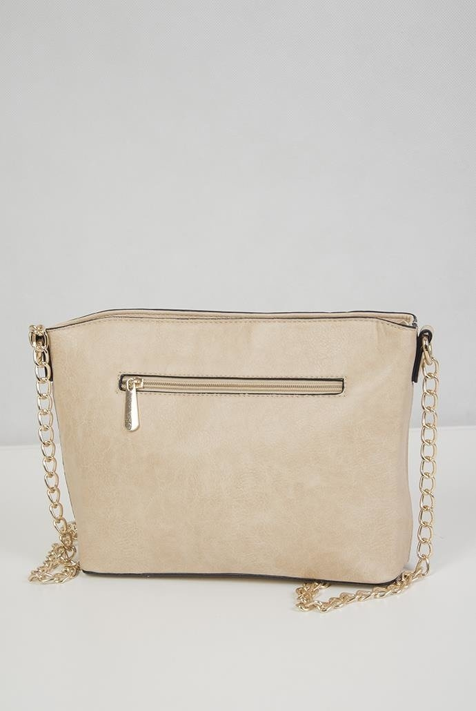 Beżowa torebka na złotym łańcuszku. Posiada przegródki na klucze czy portfel.