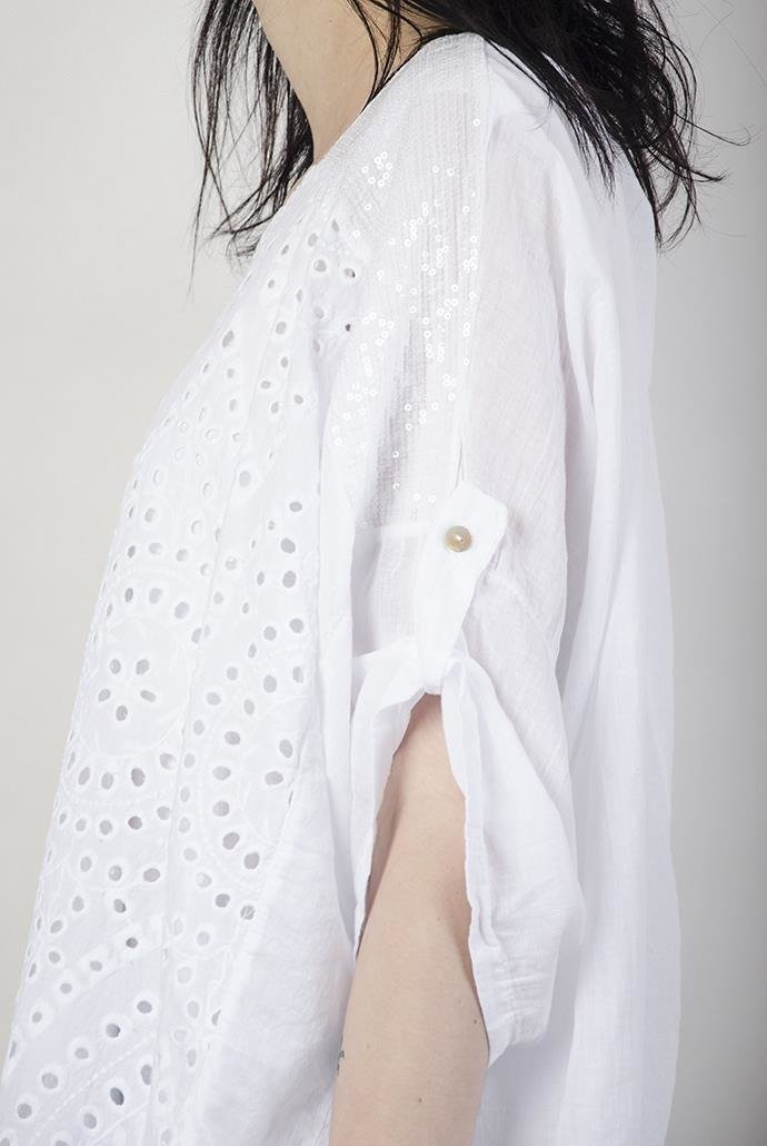 Biała bluzka z wyciętym wzorem, z cekinami przy ramionach.