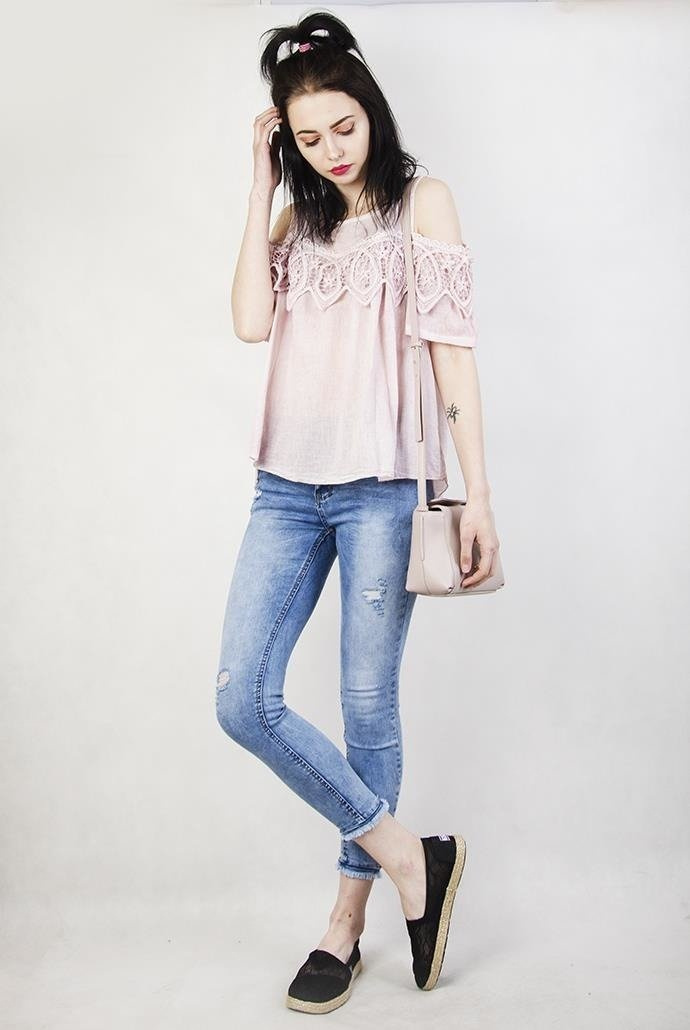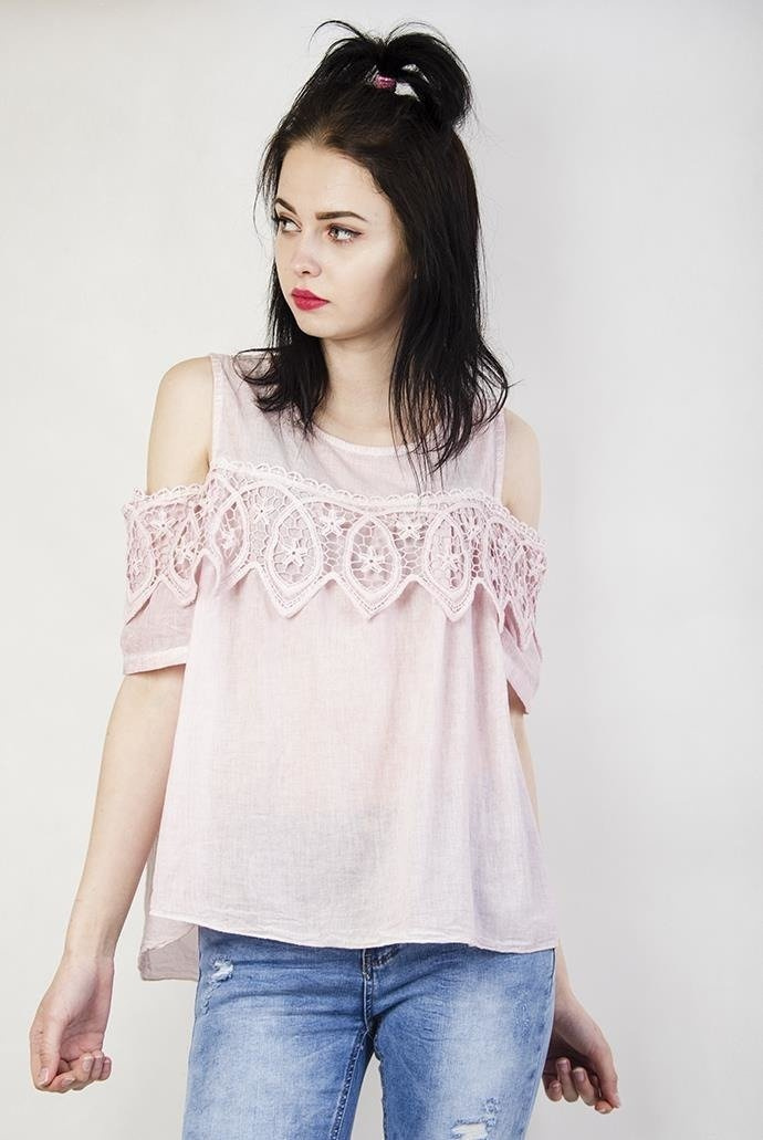 Jasnoróżowa bluzka z wyciętymi ramionami i ażurowym zdobieniem