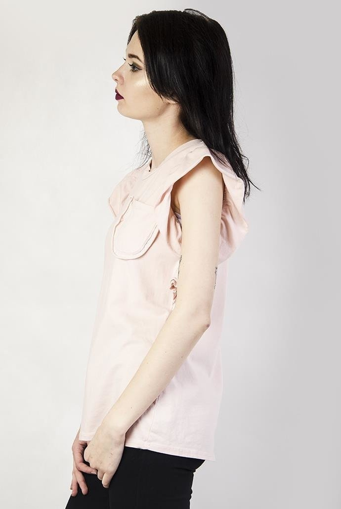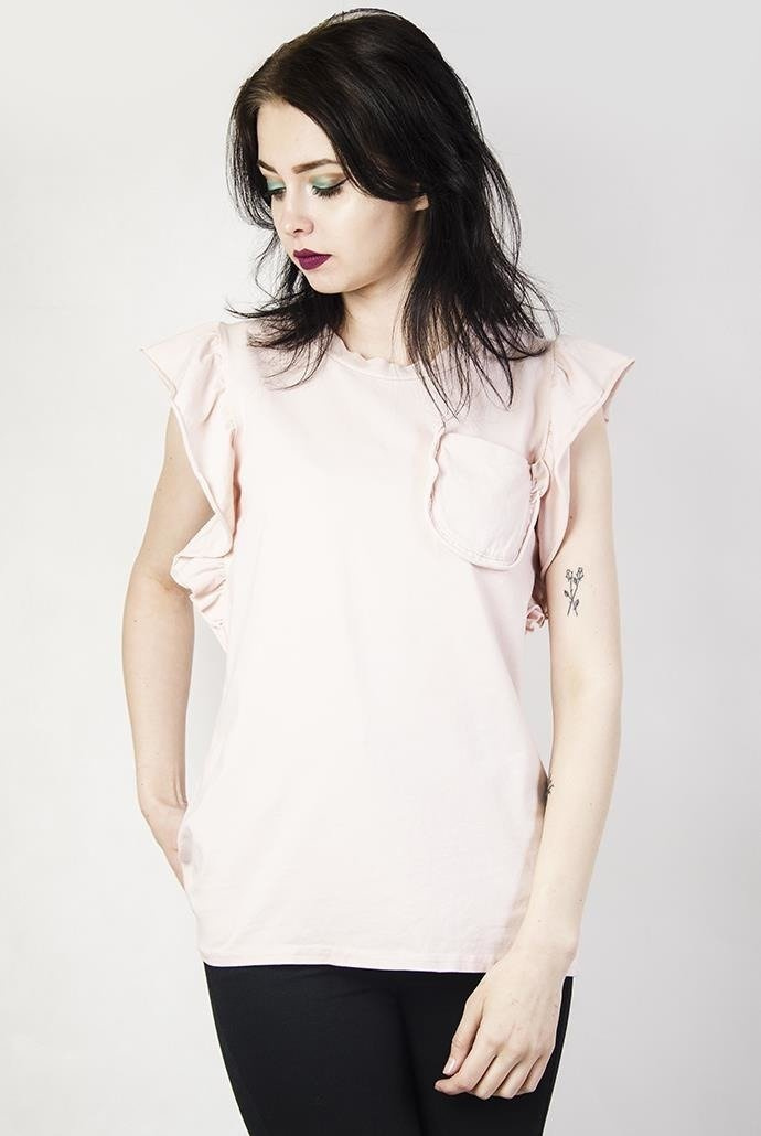Jasnoróżowa bluzka z kieszonką i falbankami.
