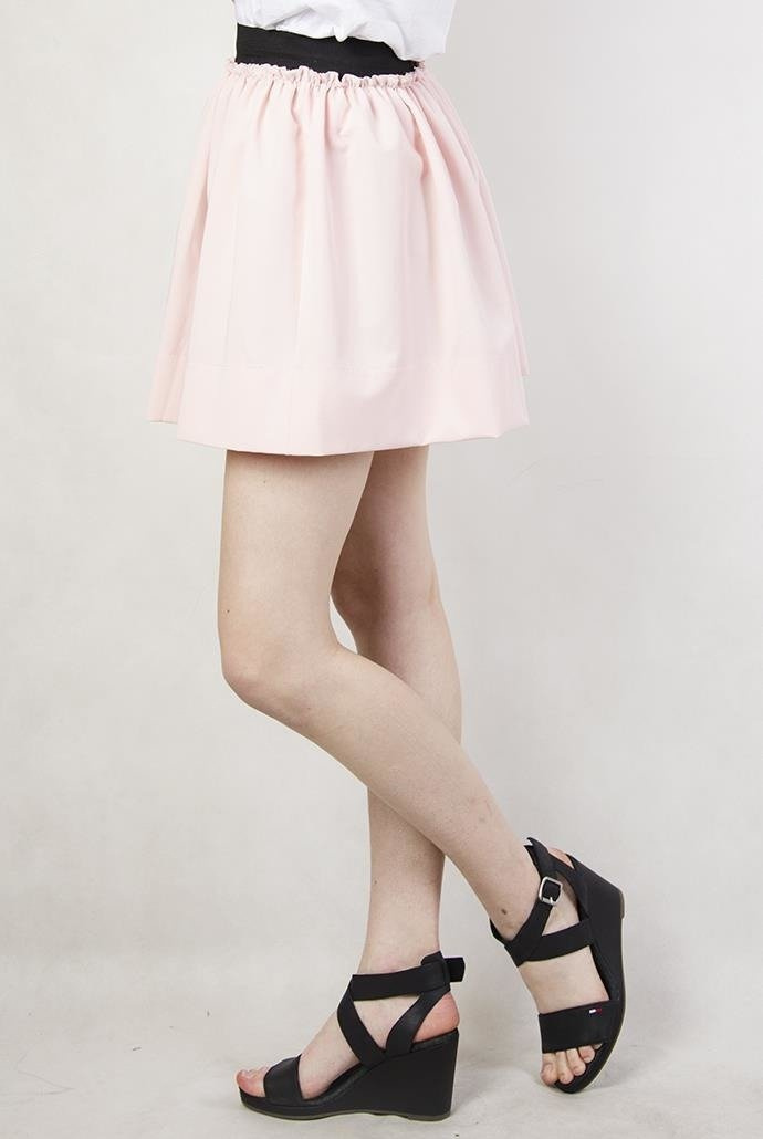 Jasnoróżowa rozkloszowana spódniczka z gumą w pasie.