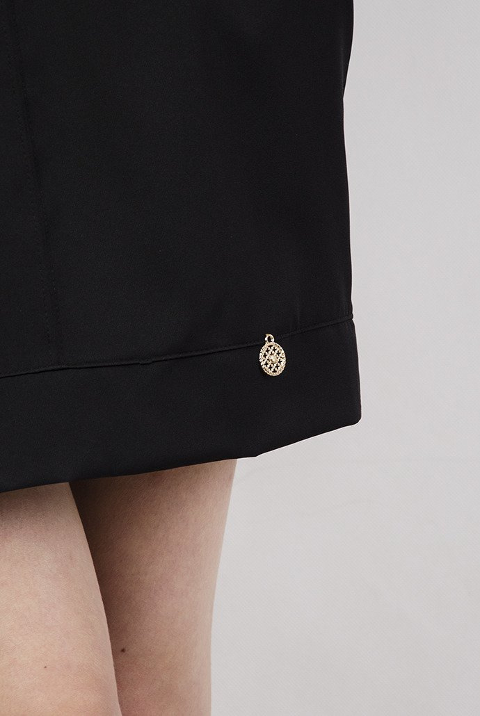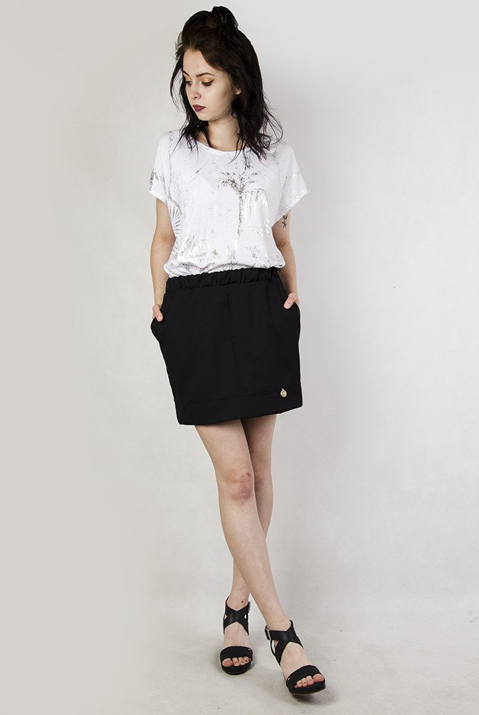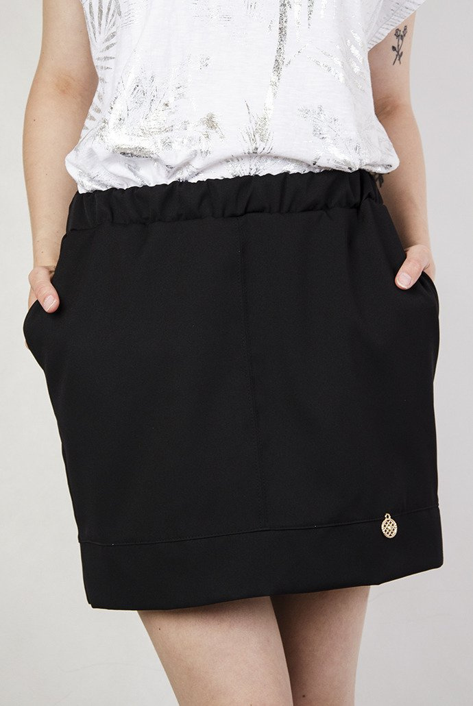 Czarna spódnica z kieszeniami, na gumce. Posiada złote kółko na dole.