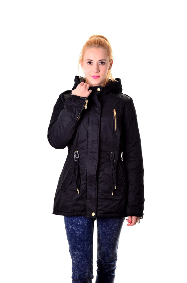Ciepła kurtka z kapturem, oraz wstawkami skóry ekologicznej na ramionach, wiązana w talii. Rękawy wykończone skórą ekologiczną z ozdobnymi zamkami.