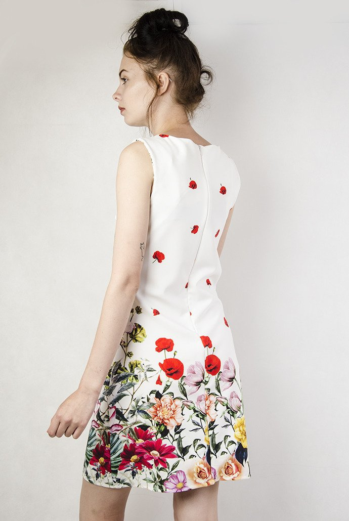 Biała sukienka o prostym kroju, w kwiaty. Wykonana z gładkiego materiału.