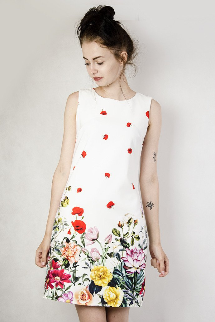 Biała sukienka o prostym kroju, w kwiaty
