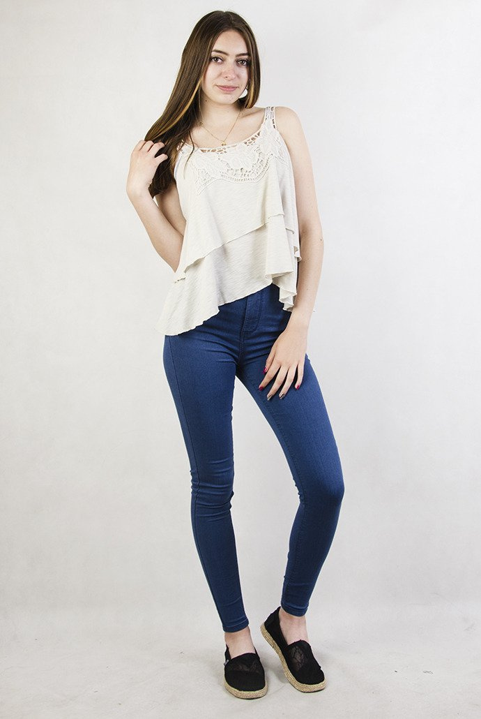 Beżowa bluzka z falbankami i ażurowymi zdobieniami.