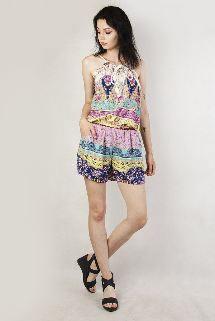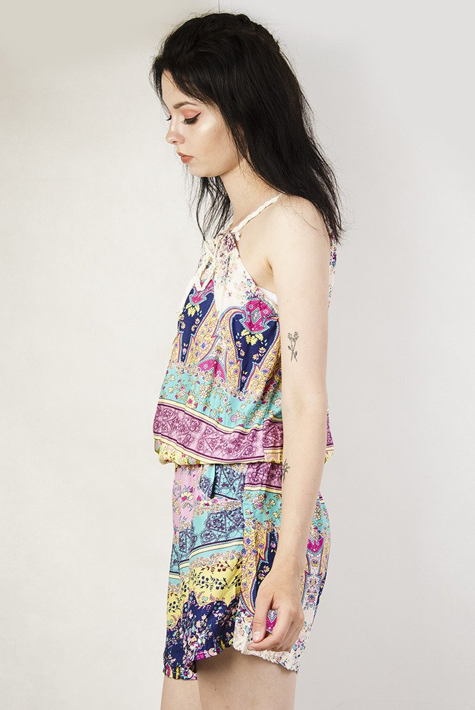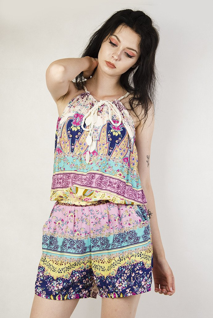 Wielokolorowy zwiewny kombinezon z wiązaniem wykończonym listkami.