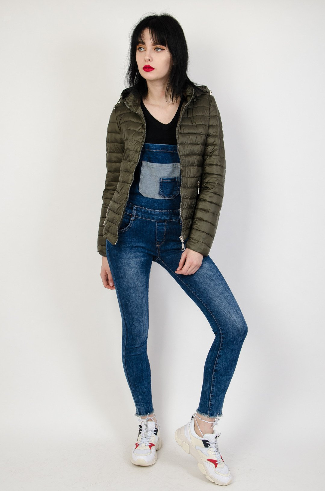 Zielona, pikowana kurtka z kapturem. Posiada wstawkę z materiału przy boku.