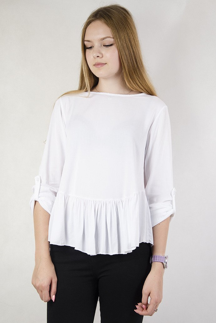 Biała, gładka bluzka z odcięciem na dole. Posiada możliwość zapięcia rękawa.