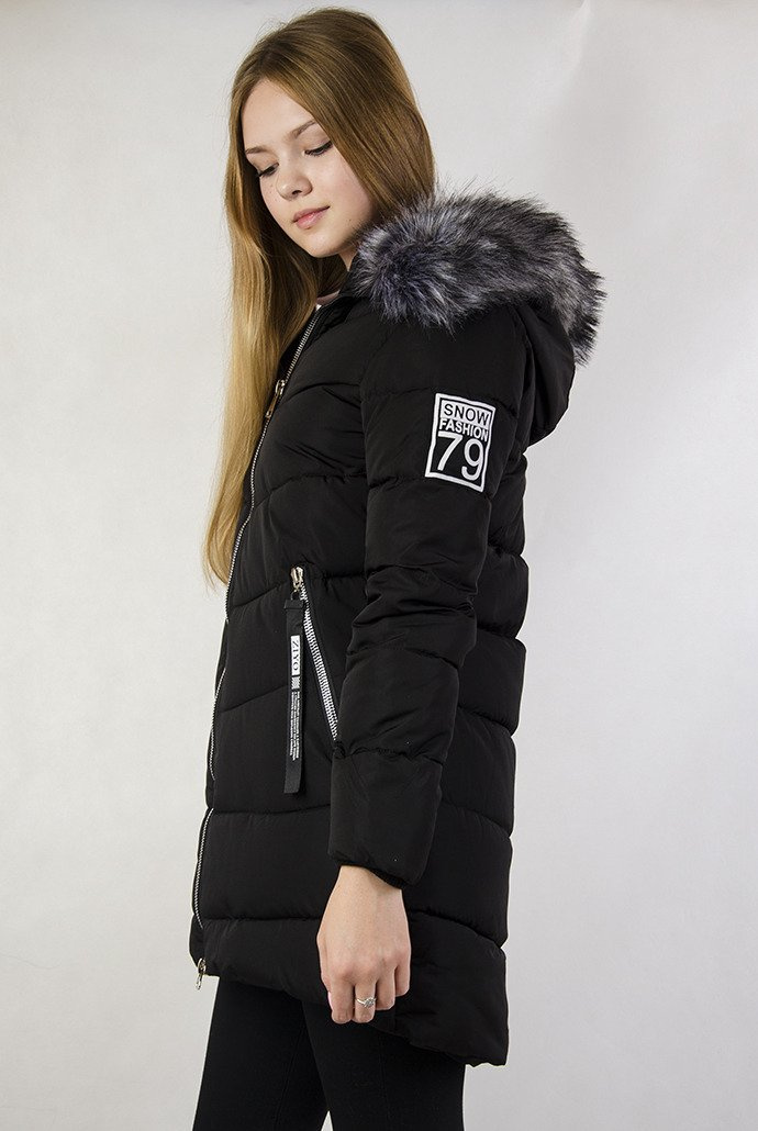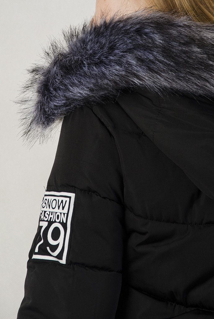 Czarna, pikowana, przedłużana kurtka z naszywkami.