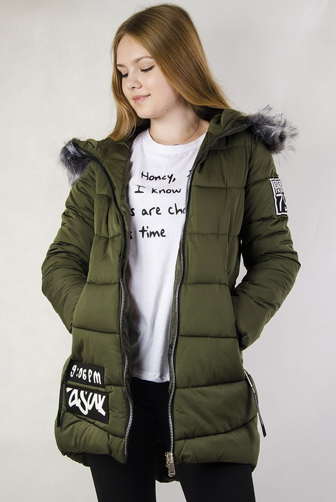 Zielona, pikowana, przedłużana kurtka z naszywkami.