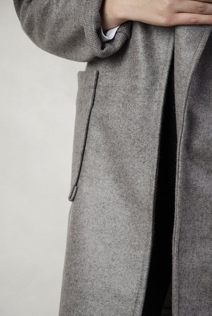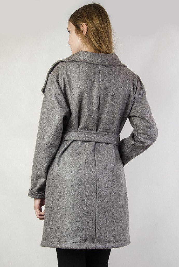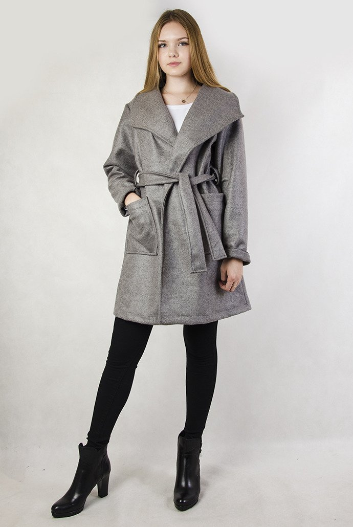 Szary płaszcz wiązany w pasie
