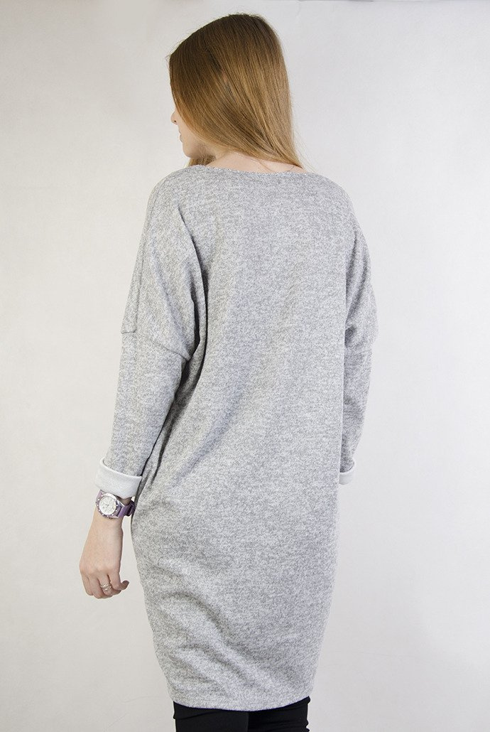 Jasnoszara tunika z cekinową kieszenią oraz przeplatana srebrną nicią