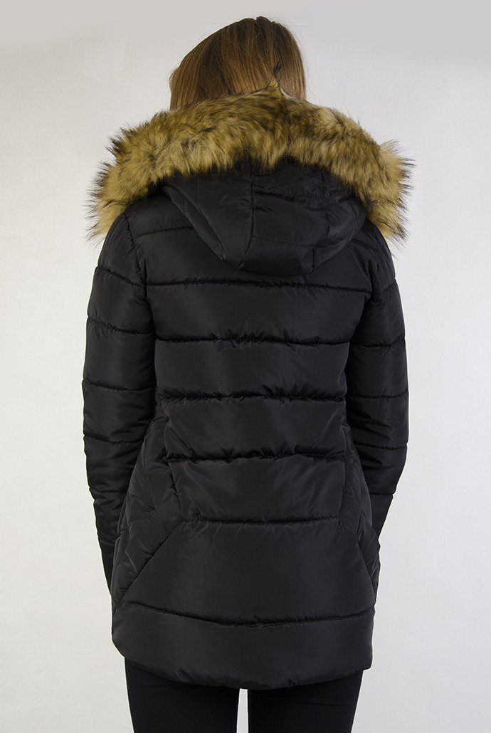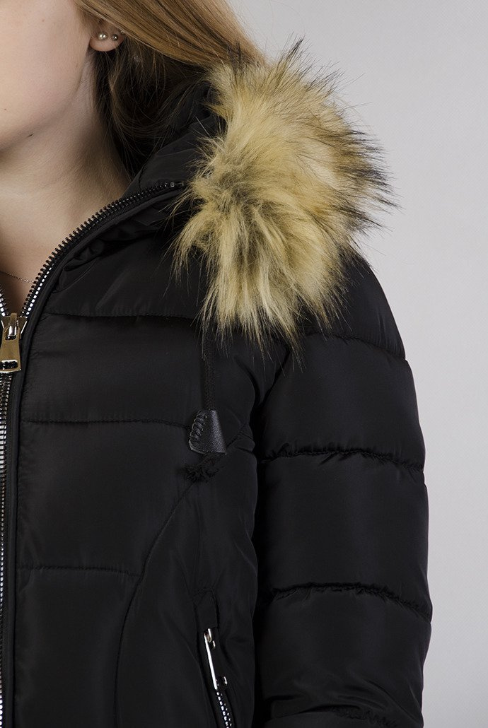 Czarna asymetryczna kurtka z pikowaniem oraz futerkiem przy kapturze