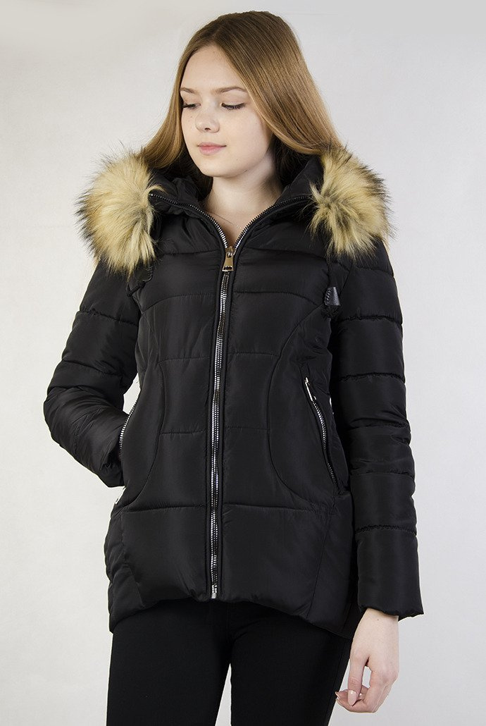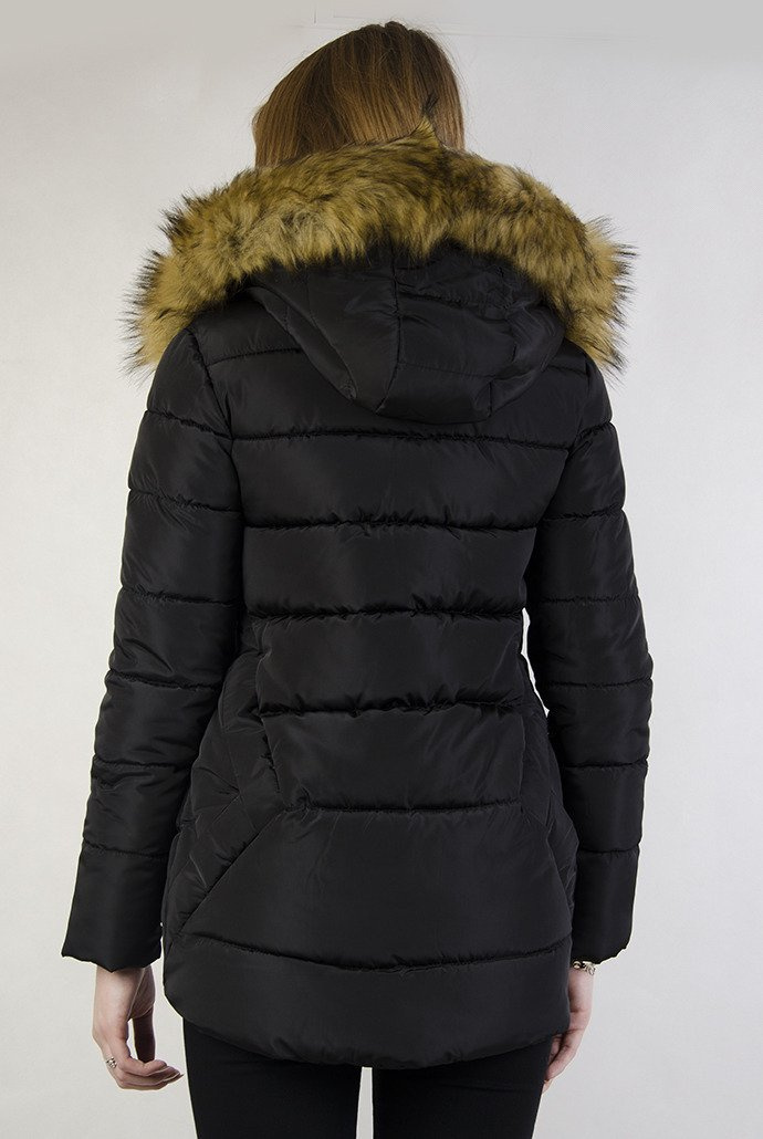 Czarna  asymetryczna kurtka z pikowaniem oraz futerkiem przy kapturze.