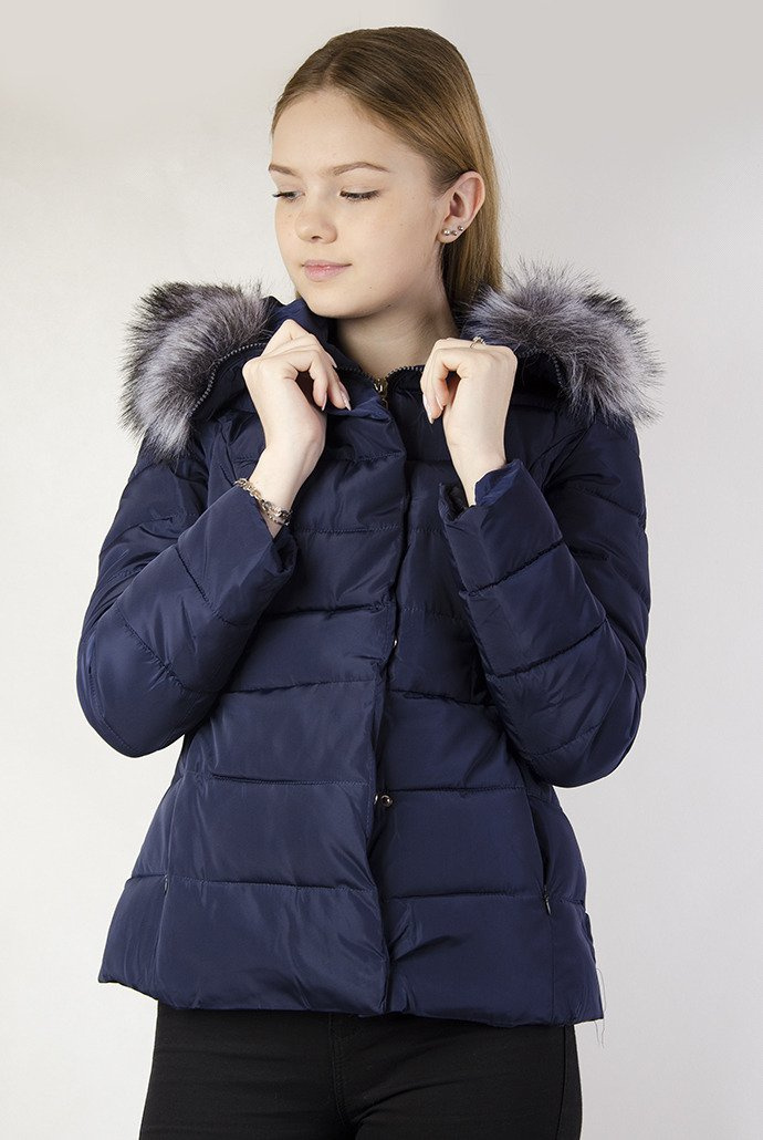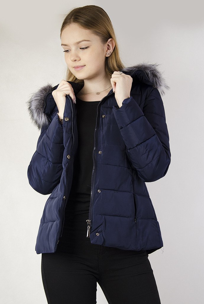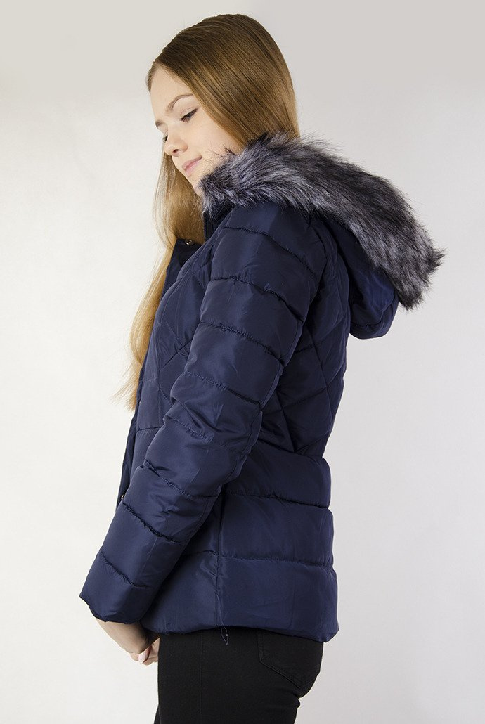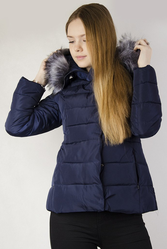 Krótka pikowana granatowa kurtka z futerkiem przy kapturze