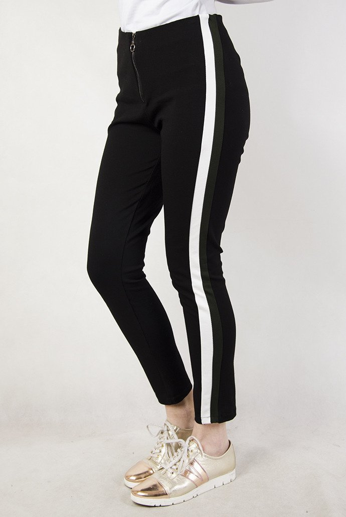 Czarne materiałowe spodnie z biało-zielonymi paskami