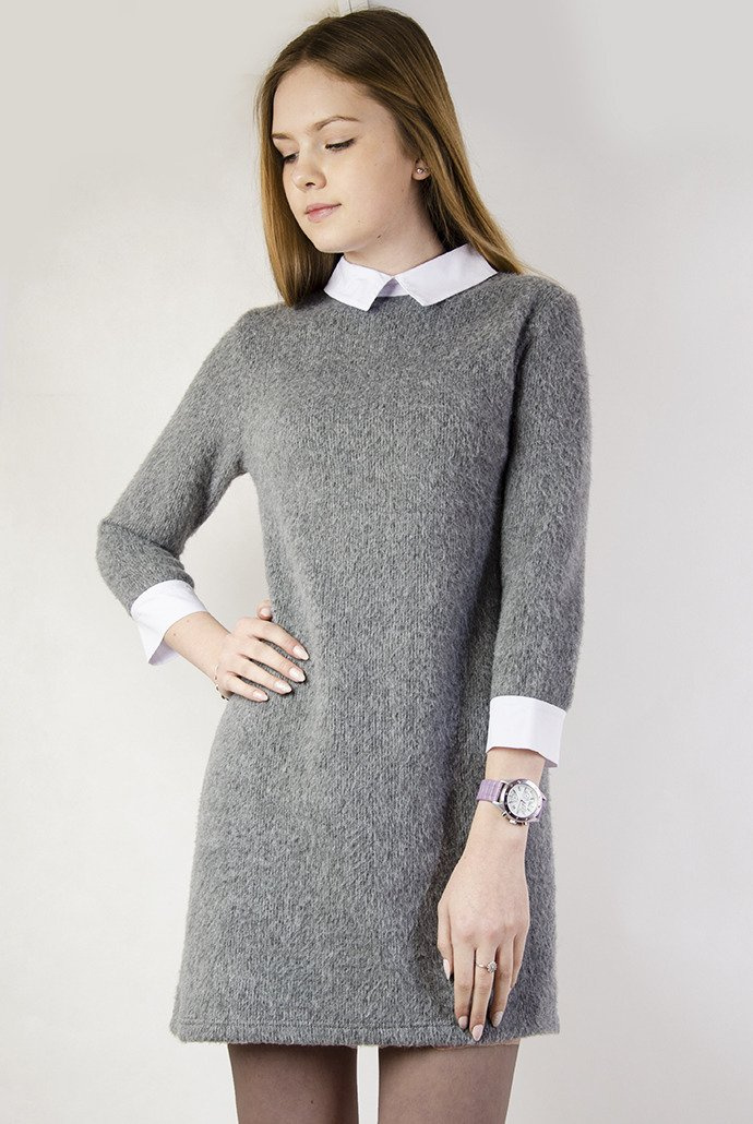 Szara dzianinowa sukienka z białym kołnierzykiem i mankietami