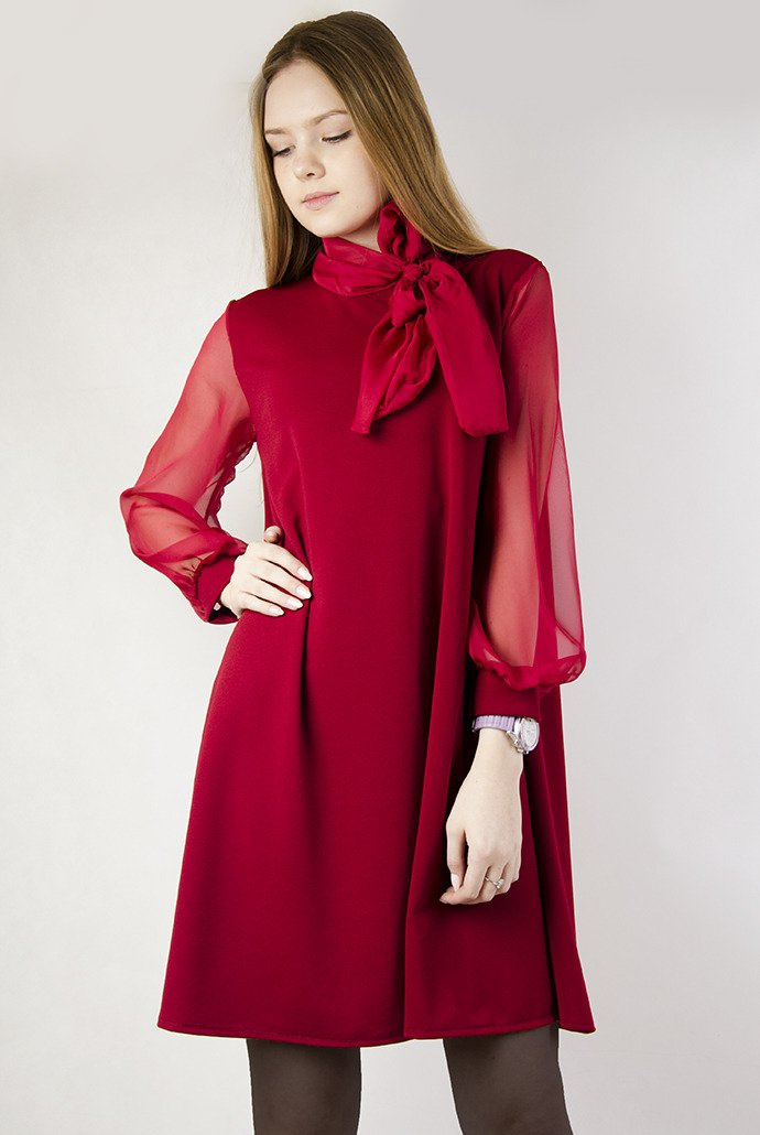 Zwiewna bordowa sukienka z rękawami z tiulu
