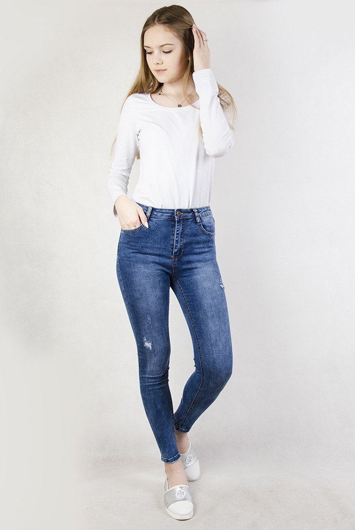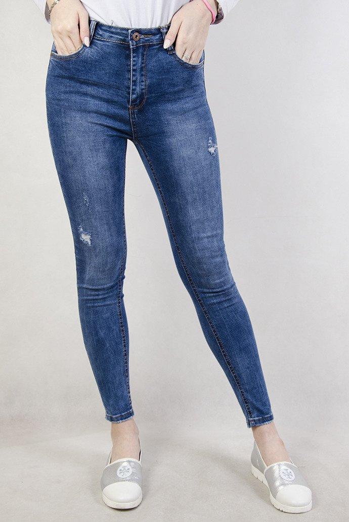 Jasne spodnie jeansowe z przetarciami oraz wysokim stanem
