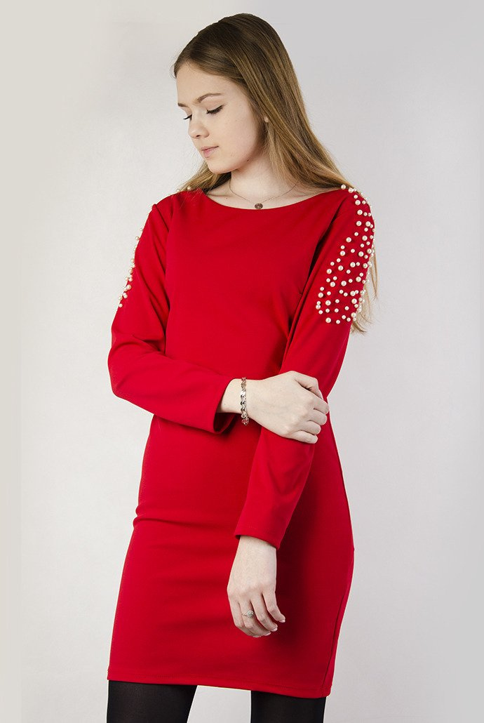 Czerwona dopasowana sukienka z perełkami na ramionach