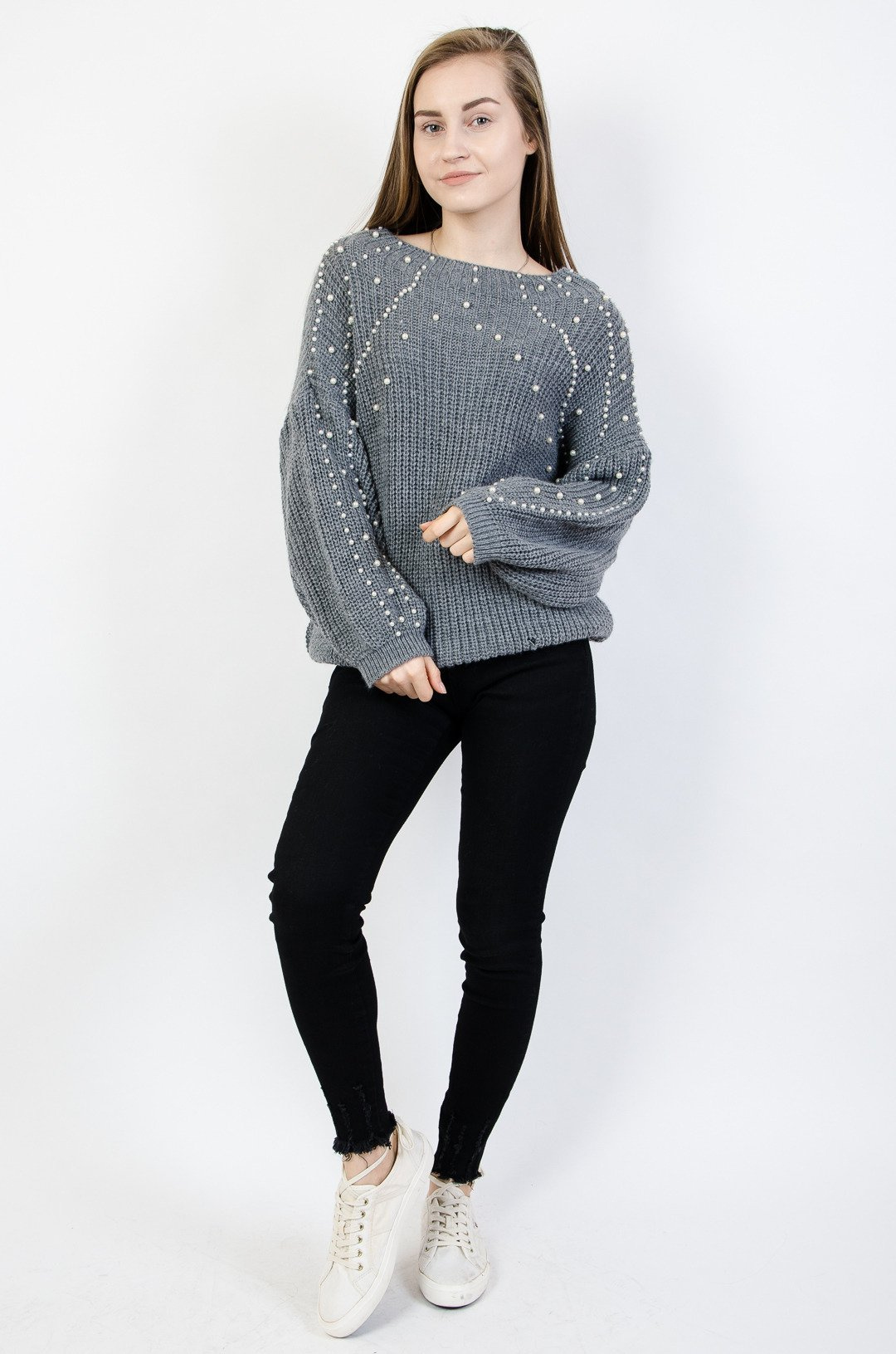 Szary sweter z szerokimi rękawami oraz doszytymi perełkami