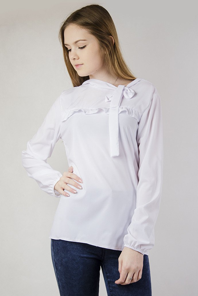 Biała bluzka koszulowa z falbanką oraz wiązaniem przy szyi