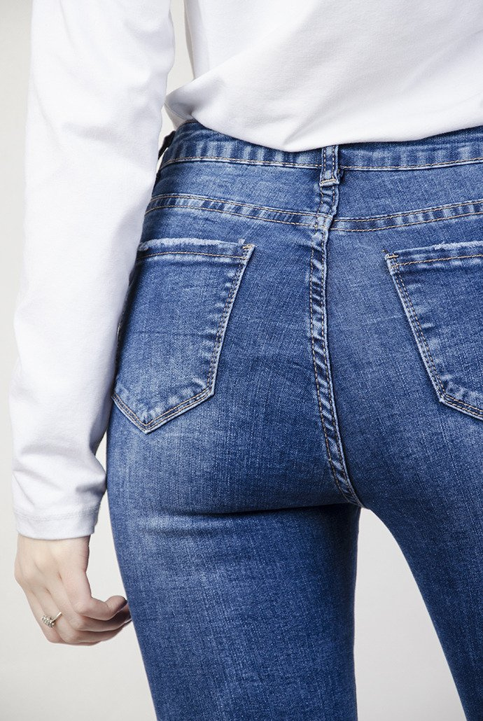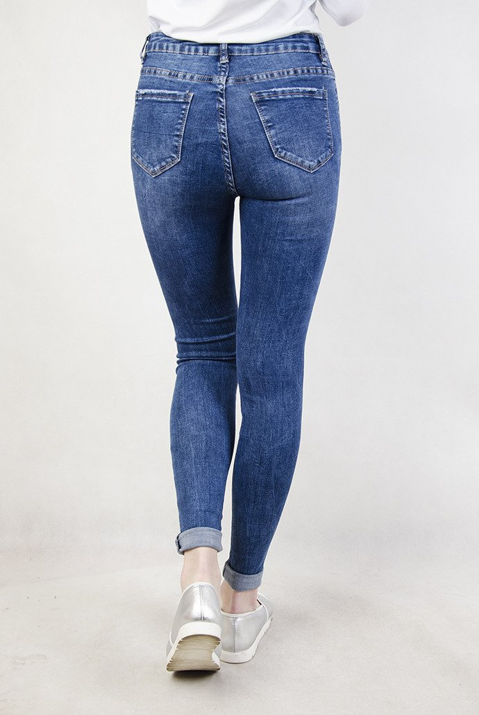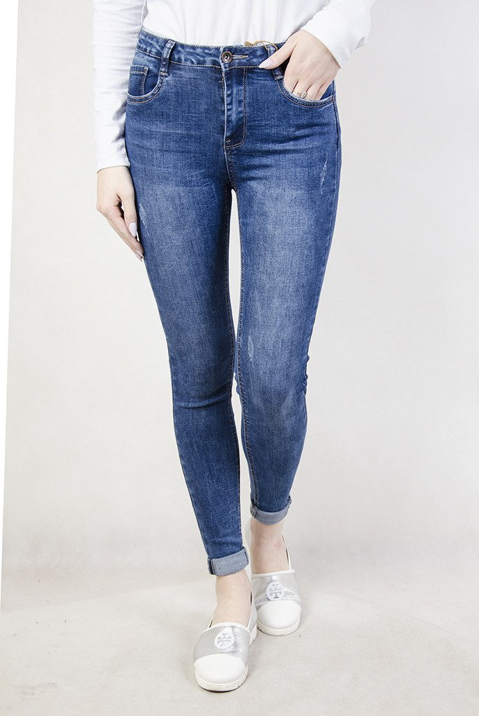 Spodnie jeansowe z przetarciami oraz wywijaną nogawką