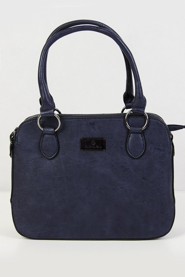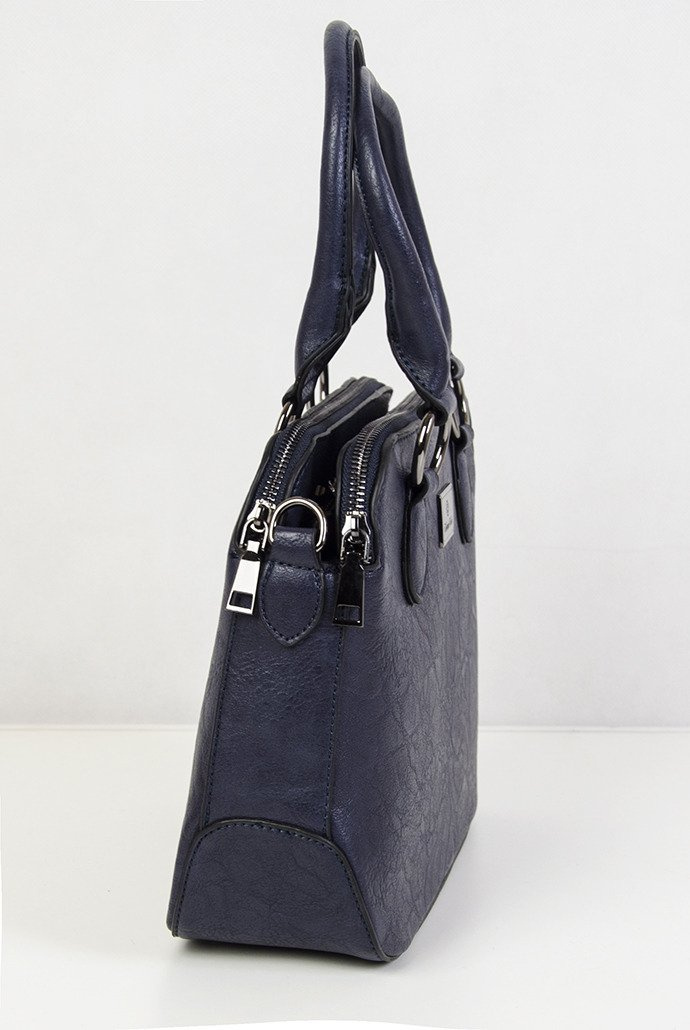 Granatowa torebka usztywniana. Nie mieści A4. Posiada usztywniane rączki oraz pasek, który można doczepić.
