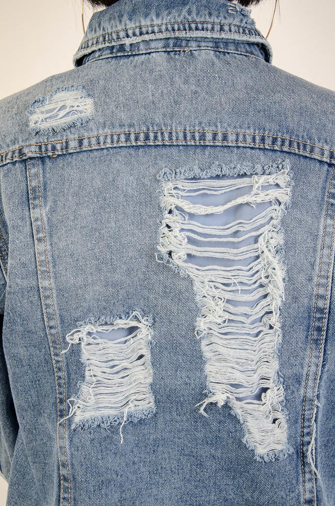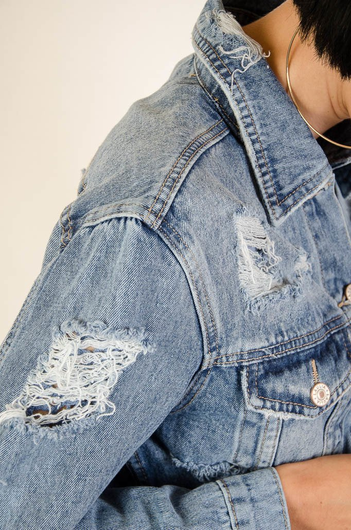 Kurtka jeansowa zapinana na guziki, z przetarciami
