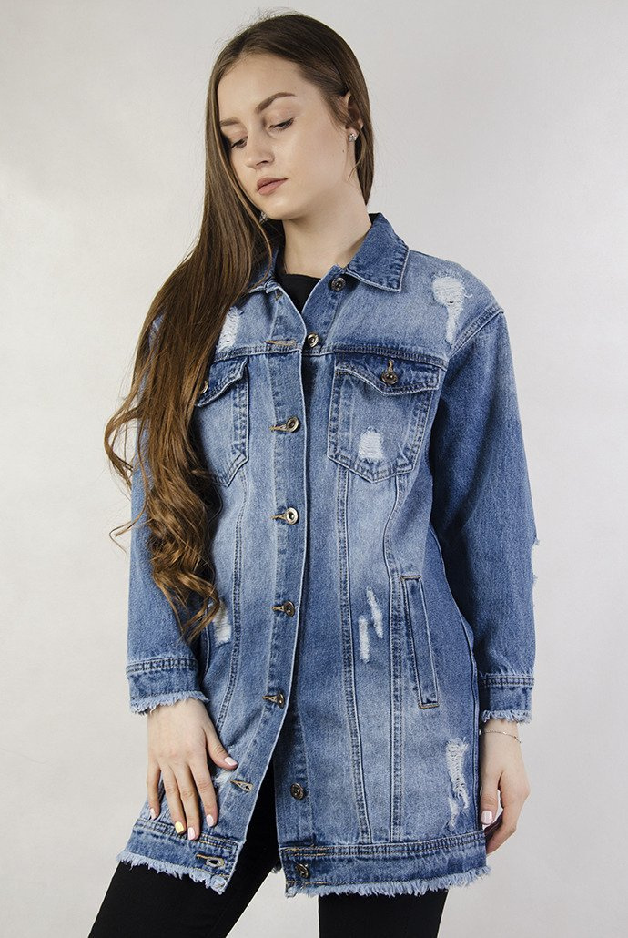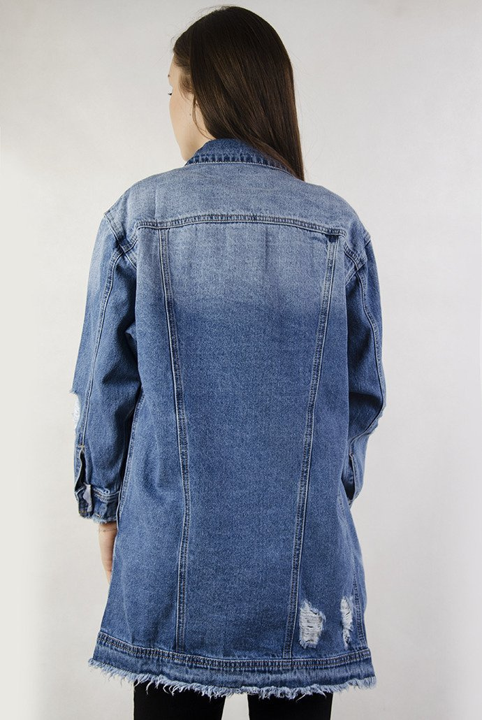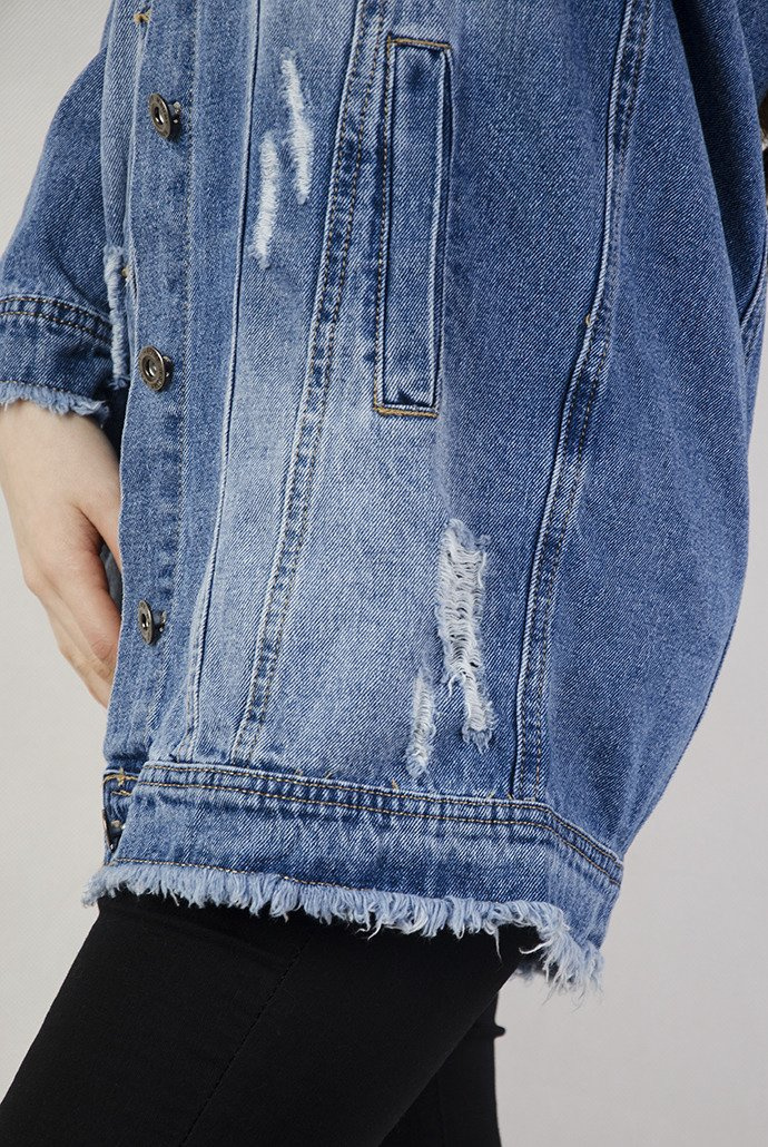 Ciemna kurtka jeansowa przedłużana z szarpaniem na dole