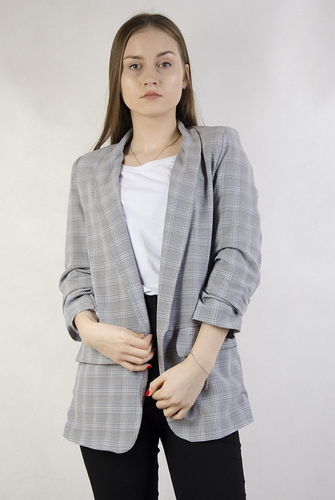 Szara marynarka w kratkę z marszczeniem na rękawach