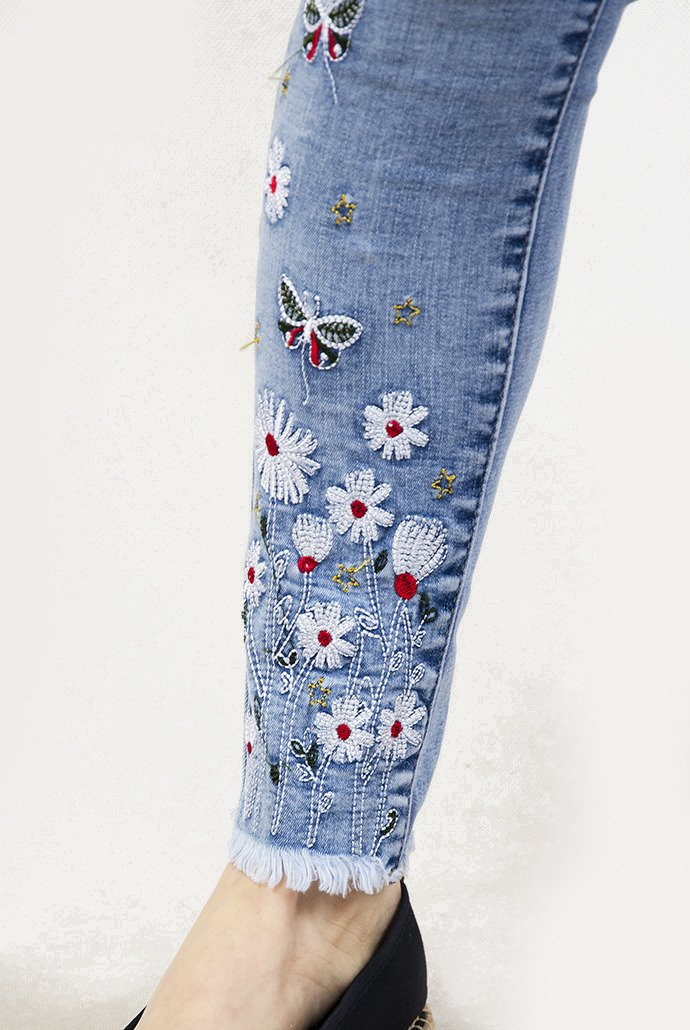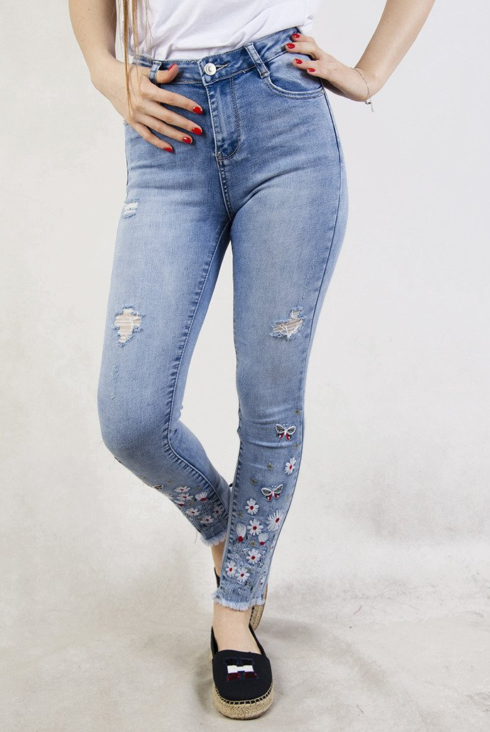 Jasne spodnie jeansowe z kolorowymi kwiatami