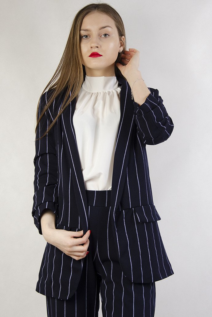Granatowa marynarka w prążki z marszczonymi rękawami