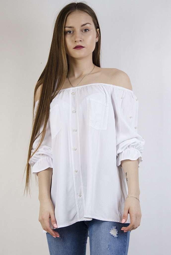 Biała bluzka z hiszpańskim dekoltem i koralikami