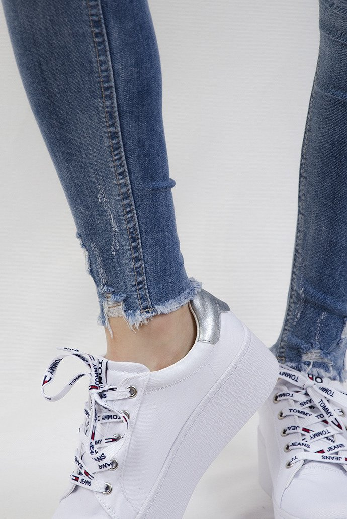 Jasne spodnie z przetarciami i szarpaniem