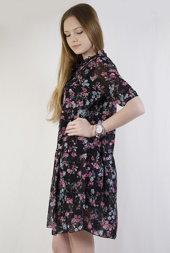 Zwiewna czarna sukienka w kwiaty z wiązaniem przy szyi