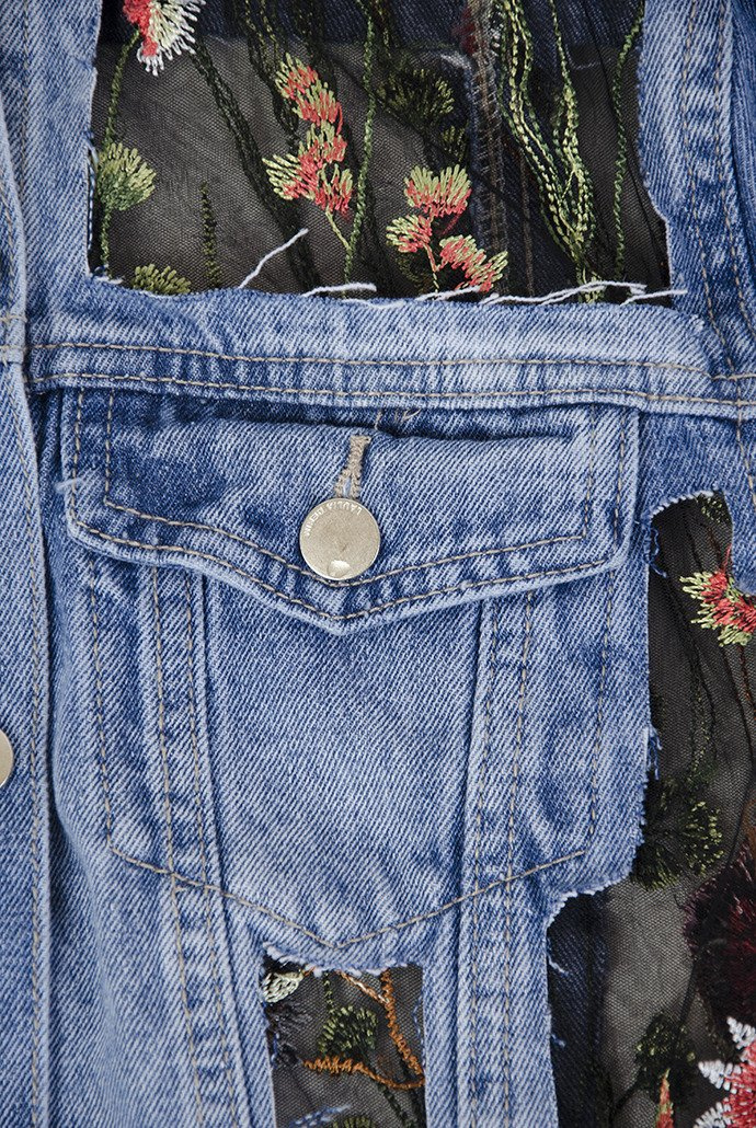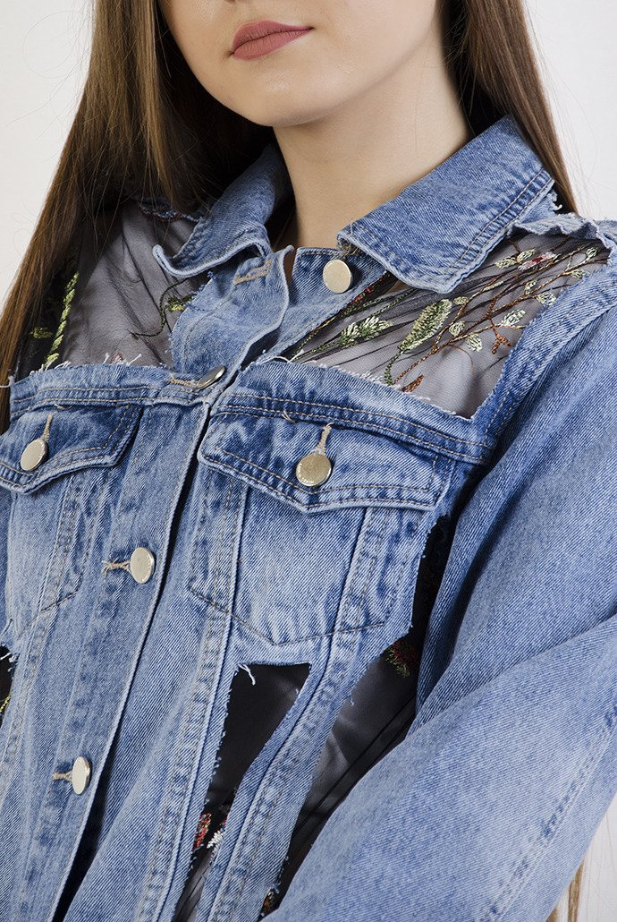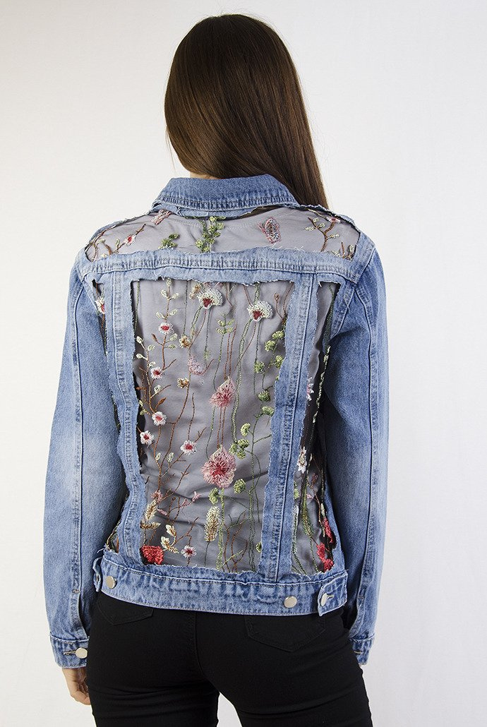 Kurtka jeansowa z haftami i elementami prześwitującymi. Wzór kwiatowy.