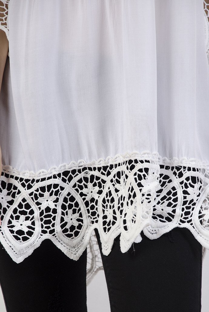 Biała bluzka z ażurowymi wstawkami oraz wiązaniem przy dekolcie