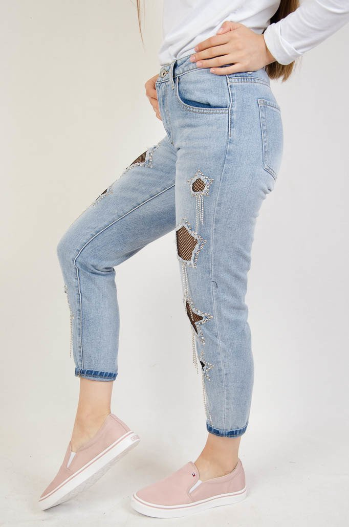 Spodnie jeansowe typu boyfriend w gwiazdy z czarnej siateczki, zdobione cekinami.