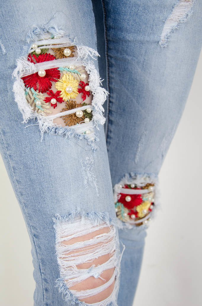 SPODNIE JEANSOWE Z KWIATOWYM HAFTEM