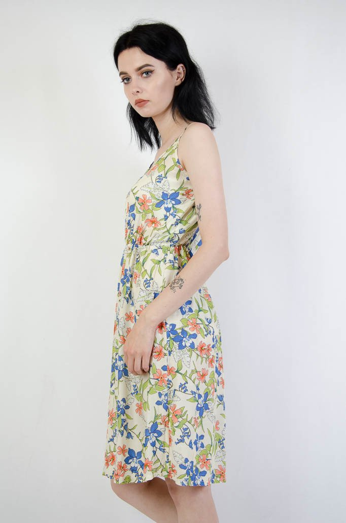 Beżowa sukienka w kolorowe kwiaty z gumką w pasie