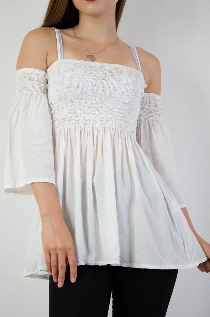 Biała bluzka z odkrytymi ramionami oraz perełkami